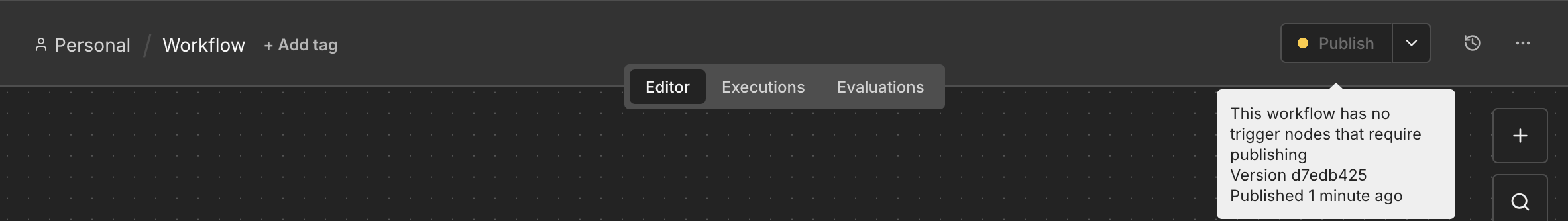 n8n auto saves your workflow while you're editing. When you're ready to put the workflow into production, publish your workflow. This approach prevents accidental production changes while enabling safe iteration and review.